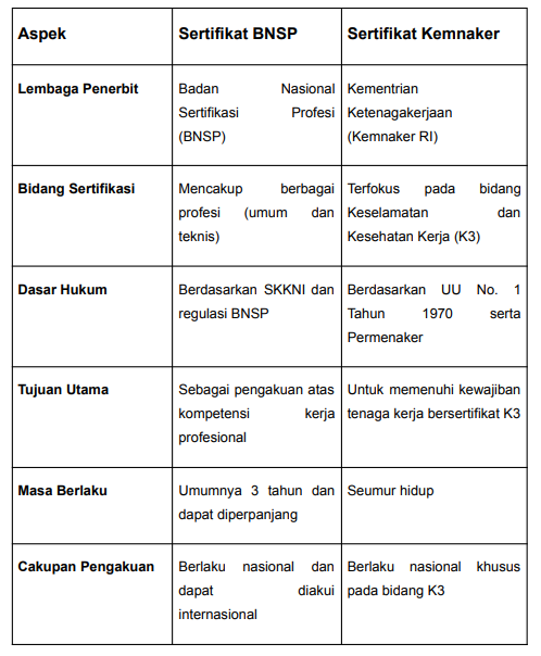 Secara umum sertifikat BNSP bersifat lintas bidang dan dapat digunakan di berbagai profesi, sementara sertifikat Kemnaker fokus pada pemenuhan standar K3 di lingkungan kerja.